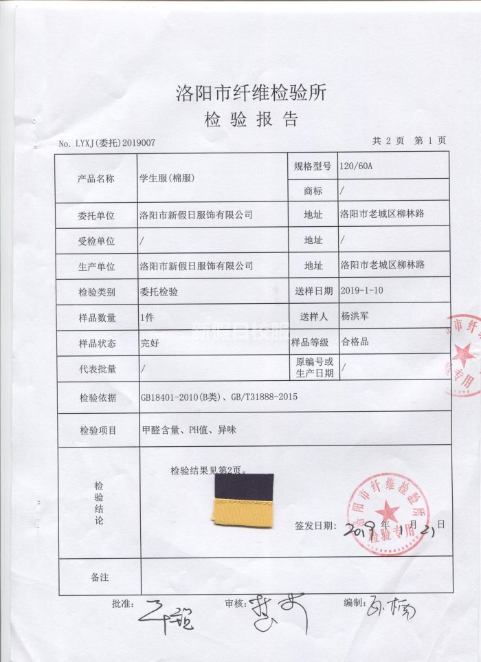 學(xué)生服(棉服)檢驗合格報告