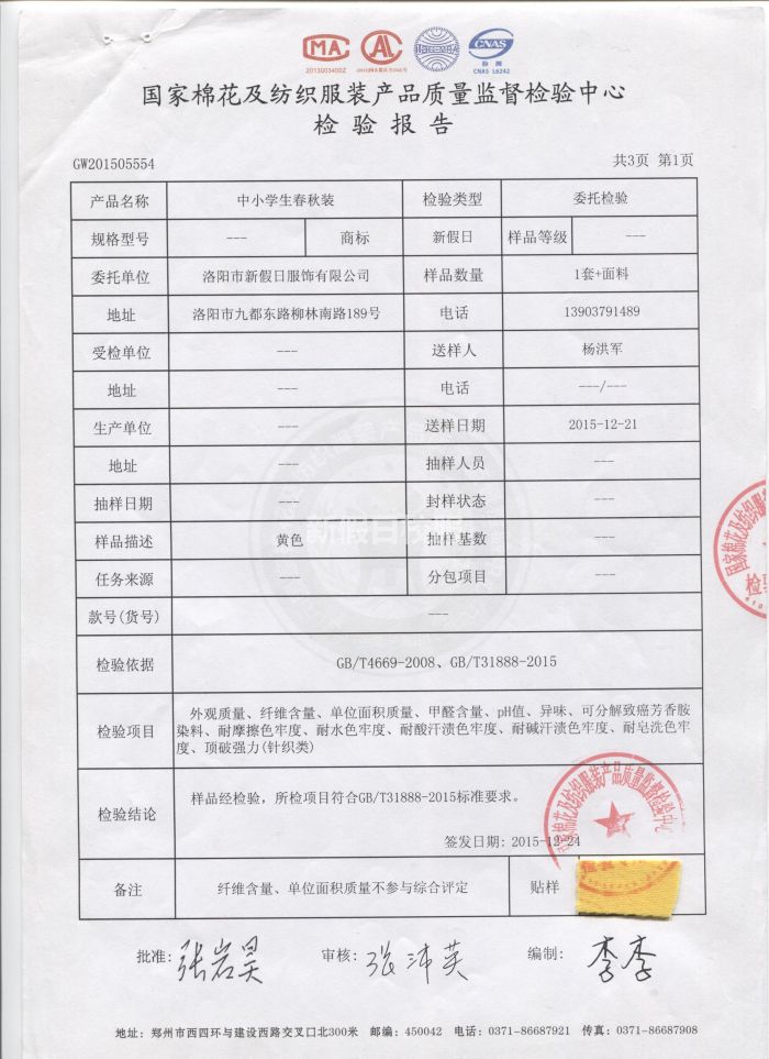中小學(xué)生秋冬裝 檢驗(yàn)合格報(bào)告